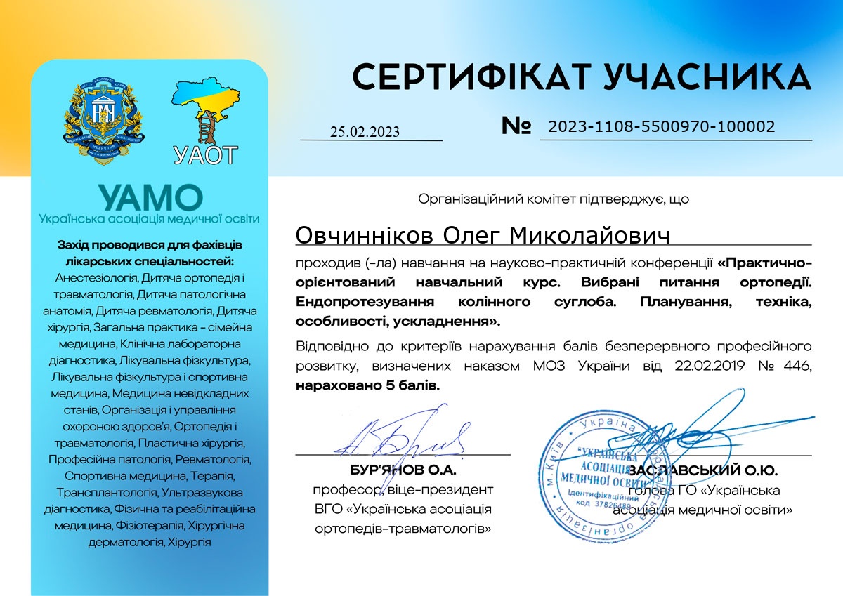 Науково-практична конференція: «Практично орієнтовний навчальний курс. Вибрані питання ортопедії. Ендопротезування колінного суглоба. Планування, техніка, особливості, ускладнення»
