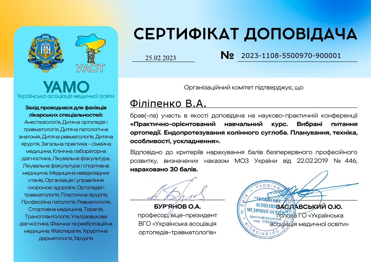 Практично-орієнтований навчальний курс "Вибрані питання ортопедії: Ендопротезування кульшового суглоба. Планування, техніка, особливості, ускладнення"
