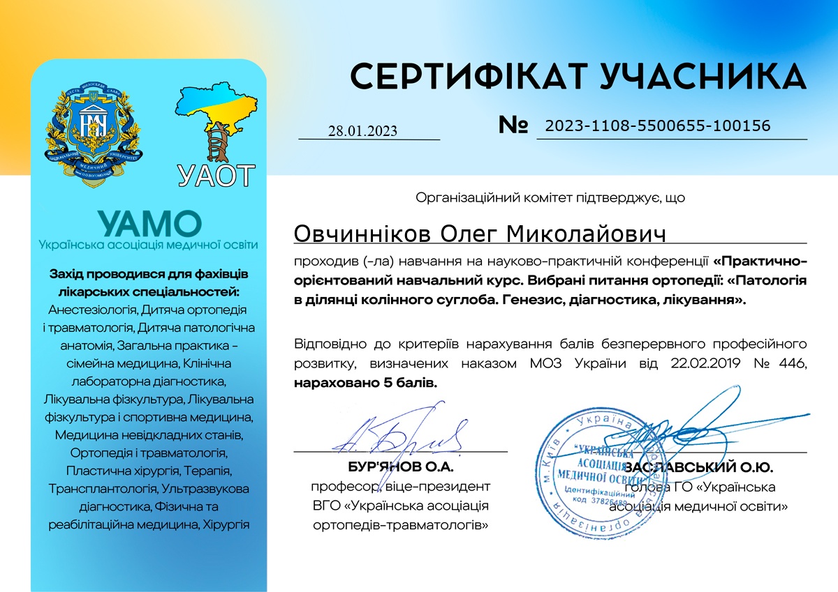 Науково-практична конференція: «Практично орієнтовний навчальний курс. Вибрані питання ортопедії. Патологія в ділянці колінного суглоба. Генезис, діагностика, лікування»