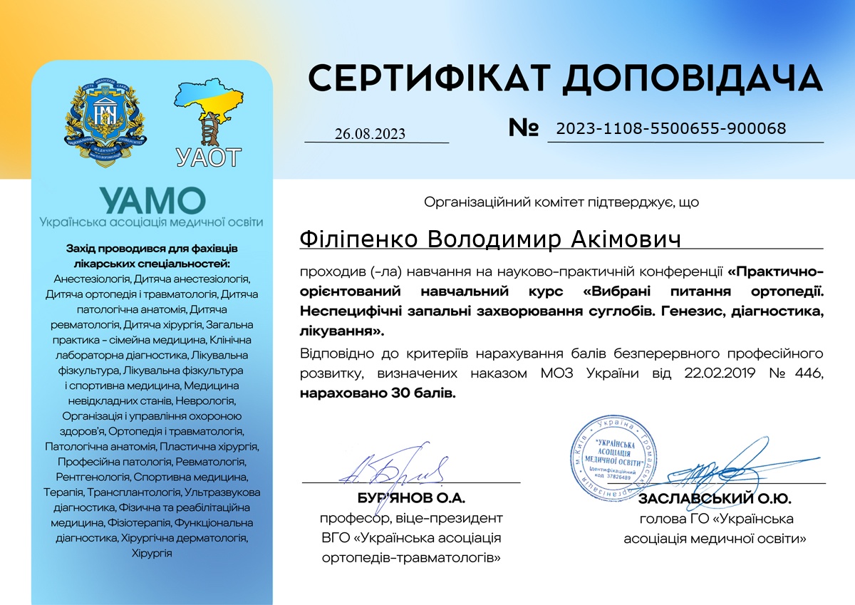 Практично-орієнтований навчальний курс "Вибрані питання ортопедії: Неспецифічні запальні захворювання суглобів. Генезис, діагностика, лікування"